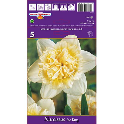 Narcissus frotte Ice King е впечатляващ сорт, съчетаващ бели, кремави и жълти цветове. Ненапразно сортът се нарича "Леден крал" - кремавите венчелистчета и деликатната кремавожълта терлиева корона напомнят на горд принц в наметало. Махровото цвете привлича погледите със своята грация и очарование. Вълни от деликатен аромат съпътстват цъфтежа на тези очарователни нарциси. Растенията растат и презимуват отлично на открито, превръщайки се в достойно украшение на кралска леха.